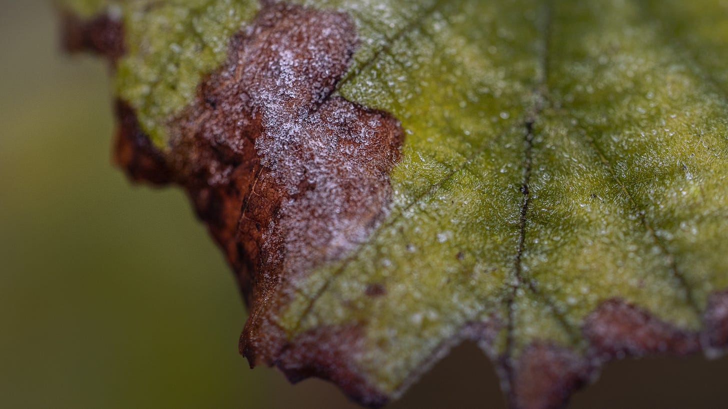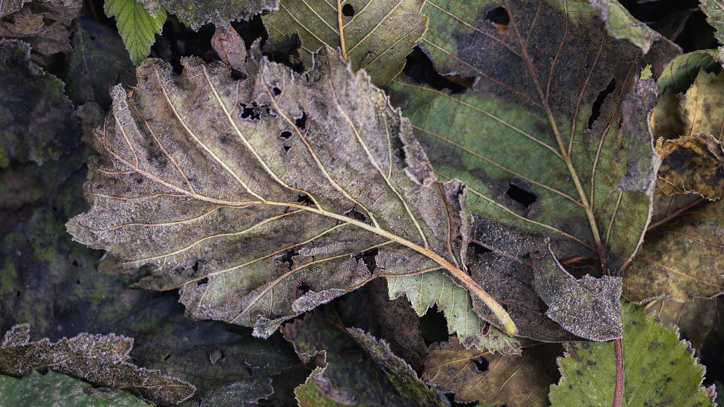 { let your eyes follow the lines of each vein. trace the edges of the layered leaves. notice they are now kissed with frost. could this be beautiful too? }
